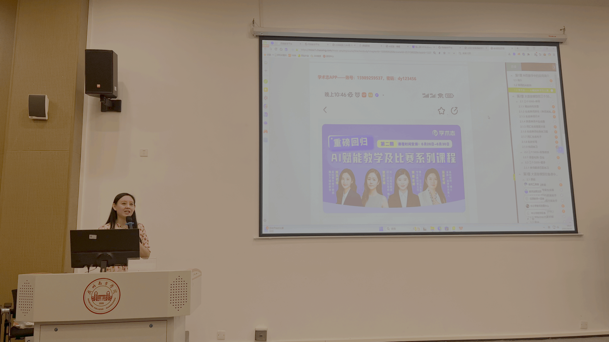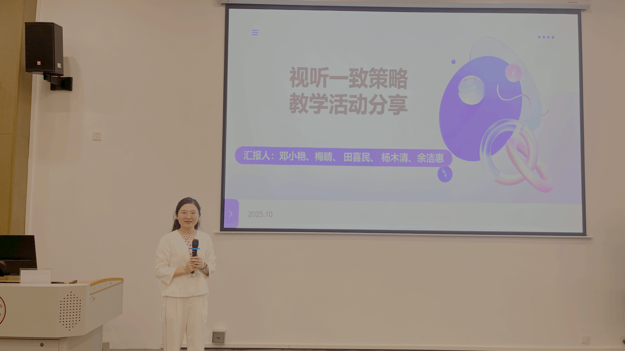 李玥老师、邓小艳老师分别做智慧课程教学法分享。李玥老师结合具体案例详细介绍和展示了AI在大学英语教学中的应用。邓小艳老师分享了大学英语听力教学过程中的视听一致原则的具体应用。
