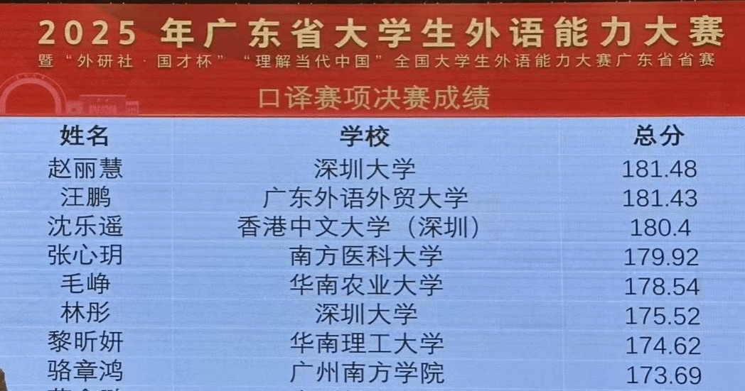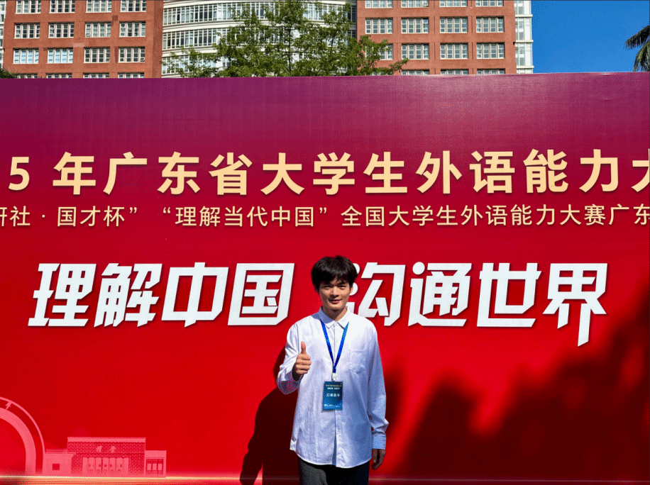 在日前收官的2025“外研社·国才杯”“理解当代中国”全国大学生外语能力大赛英语组口译赛项广东省省赛上,来自广州南方学院22级康复治疗学的骆章鸿同学不畏强手,在大学英语教学中心谢思晨老师的指导下,从110余名选手中脱颖而出,斩获全省第8,拿下口译国赛入场券——创下我校本赛项历史最佳战绩!